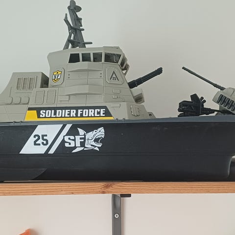 Båd, Militærbåd, Super fin militærbåd med masser af tilbehør til timers leg, hvor fantasien kan få frit spil. Der kan isættes batteri og afspilles lyde mm. Nypris 450