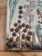 Glaserede, blandede plantemotiver især i brun/lilla/grøn på hvid/uglaseret baggrund. Mørkebrun kant. Mærket foran med signatur.