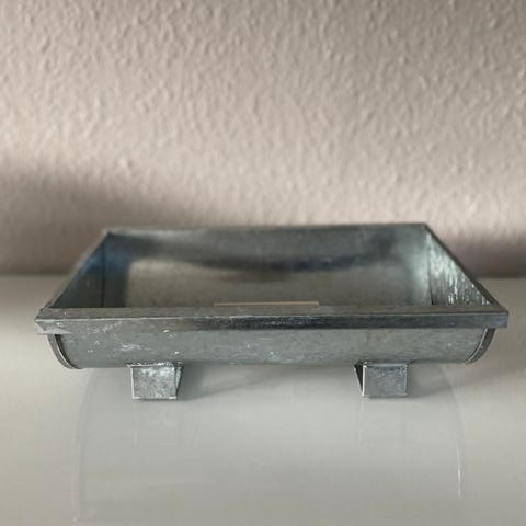 Zinkskjulere, Billede 1: Firkantet skjuler med diameter 17,5 cm og højde 10,5 cm. "Tagrende" længde 26 cm, bredde 13,5 cm og højde 10 cm. Rund 1´er med diameter 12 cm og højde 9 cm. 2 små skjulere med sommerfugle - diameter 6,5 cm og højde 8 cm.