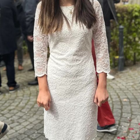 Smuk konfirmationskjole købt i Nicolai. Blødt, eksklusivt blondetof - flere lag skørt i satin og tyl for hold og fylde. Mange fine detaljer som snørelukning i ryggen og satinbånd i livet. Brugt én gang. Nypris 2600 kr.