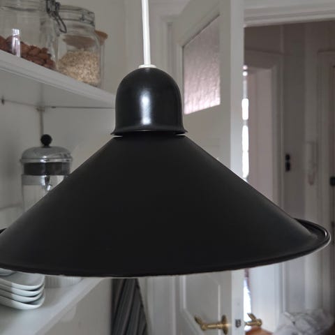 Sort kugleformet loftslampe med ledningskjuler. Fejler intet. Sælges pga. flytning. Lampen har et enkelt og tidløst design og kommer med stofbetrukket ledning.