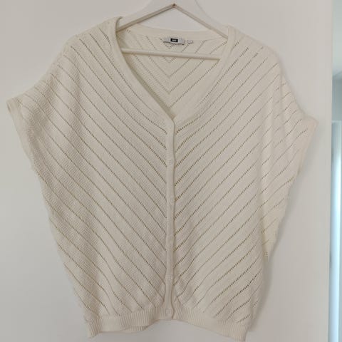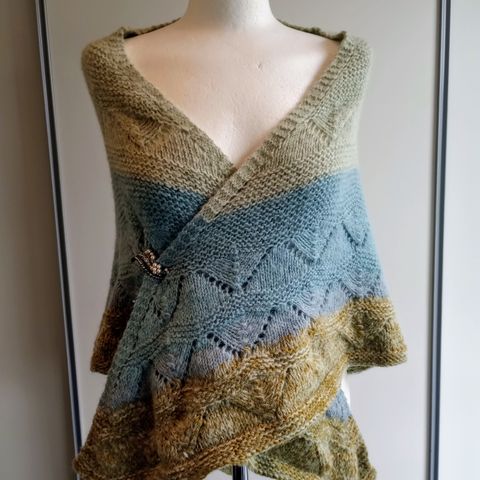 Det er hjemmestrik og i en størrelse som kan bruges som poncho, ”cardigan” og falder utrolig flot på.