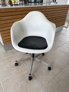 Hvid kontorstol, som kan justeres i højden. I fin stand. Nypris ca 6.000. Der medfølger en sort læderhunde fra mærker Bent Hansen. Hynden er aftagelig.