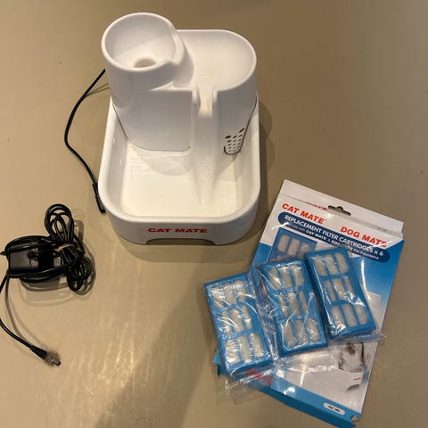 Vandbeholder elektrisk til hund og kat. Det er renset for kalk og der er filter i, der medfølger 2 nye filtre.