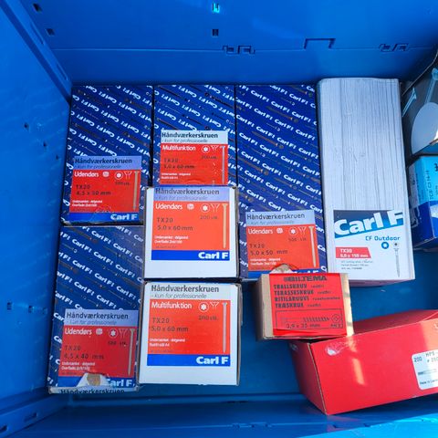 Beslag, lysstofrør 59 cm, møtrikker, rawlplugs, spejl 15 x 15 cm, skruer, søm og meget mere