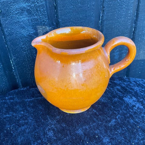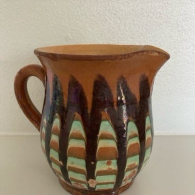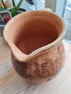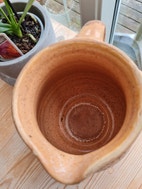 2. Beige med grøn, råhvid løbeglasur, h 13,5 cm dia 14 cm hvor bredest..afslag på kant og ved hældetud, den har været brugt og fortæller en historie... 200 kr