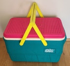 Tilbageblik til 90'erne, hvor farverne var klare: blågrønne, pink, gule dobbelt håndtag. IGLOO, Corporation, Houston Texas, Made in USA. Vintage picnic-kurven genskaber vores klassiske design, som alle elskede dengang, og som stadig er perfekt til stranddage, parkbesøg og ethvert andet udendørseventyr. Varen er i brugt vintage stand med aldres relaterede brugsspor. Mål: h: 33,5/med håndtag: 46 cm. B. 50 cm. D: 27 cm. Fra ryge-og dyrefrit hjem. Gode P forhold ved afhentning på adressen.