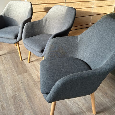Polstret spisestuestol med gråt stofsæde og -ryg samt sort stel. Stolen har buet ryglæn, der går om i siderne og giver støtte til ryg og sider. Benene er i sort materiale med let udadgående form. Egnet som spisebordsstol eller kontorstol i hjemmet.