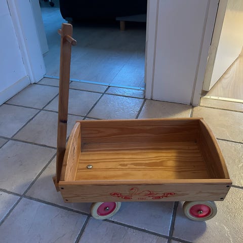Lille sød vogn med snor. Med træhjul og med sæde figure i stof