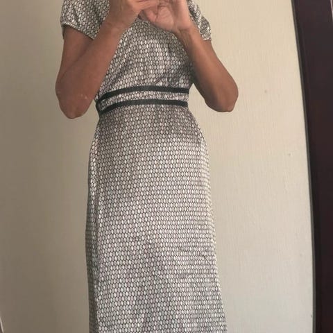 Sommerkjole, Passage, str. M, Koksgrå med lilla og hvidt mønster, Polyester/elastan, Næsten som ny, Sælger denne yndige og velsiddende kjoler i str. 40 fra ikke-ryger hjem til en AFHENTNINGSPRIS på KUN kr 75 - ved forsendelse tillægges porto.