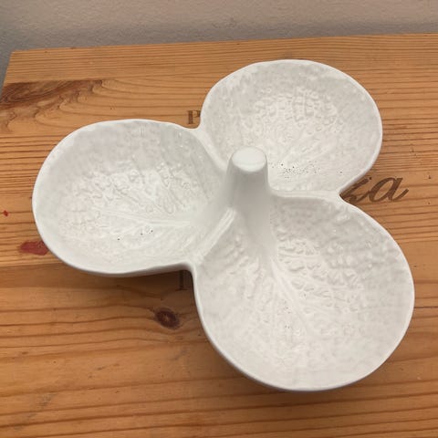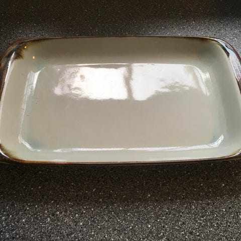 Brunt fad med små skåle., Der er desværre nogle små skår i det brune fad.