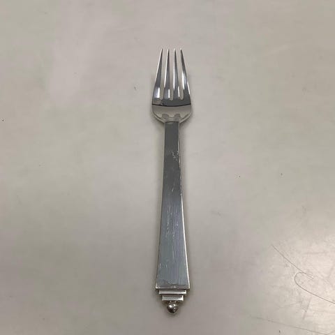 1 Pyramide kagegaffel. Design af Harald Nielsen. Stemplet Georg Jensen, Sterling og Denmark. 'Georg Jensen' stemplet er det som blev brugt efter 1945. Lille monogram på bagsiden, ellers i god stand, med let patina. 699 kr
