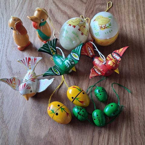 12 små håndmalede træ æg. 3 hvide, 3 gule, 3 lyse blå og 3 lyserøde - ca. 2 cm høje.