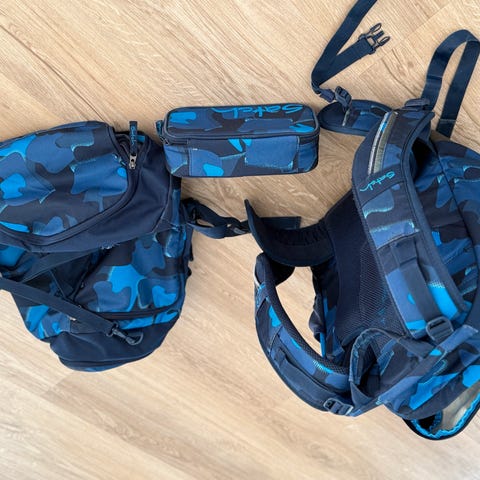 Satch rygsæk/skoletaske. 2 store rum og et mindre i front. Ternet i farverne blå og grøn. H: 45cm. B: 30cm.