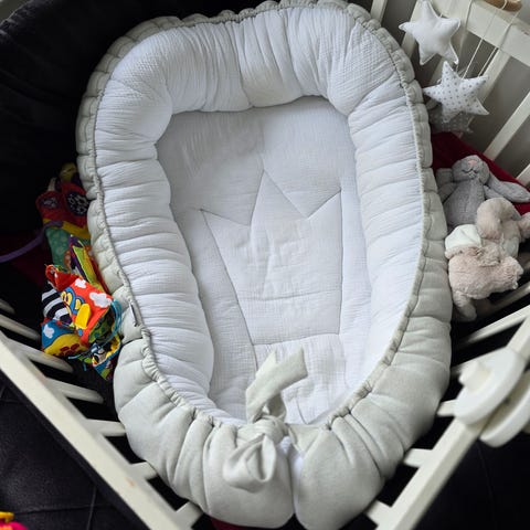 Andet, Babynest, Felicita Quadrante, Dejligt babynest med indersiden af blødt frotté og ydersiden i grå vaflet stof. Med snor, så nestet kan være mere eller mindre åbent. Vaskbart. Nyvasket med neutral vaskemiddel og uden pletter.