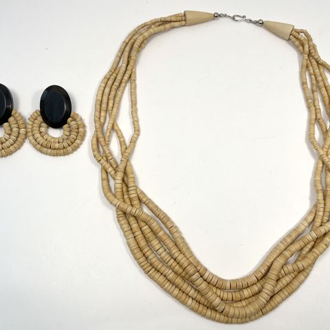 Halskæde og armbånd vintage så fint som nyt, det er ikke blevet brugt. Jeg tror at det er sort glas og sølvmetal. Der er stempler på begge dele som består af et nummer (ikke sølv tal) og et blomstersymbol. Halskæde 38 cm lang. Armbånde 18,5 cm. Bredde: 17 mm. Ann. nr. C134