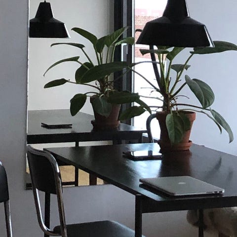 Stort spisebord i træ med sort linoleum
