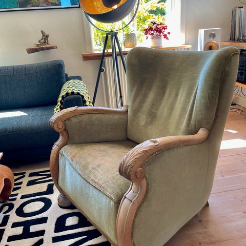 Bella lænestole i kirsebær med hynder der følge ryglænet rundt.
