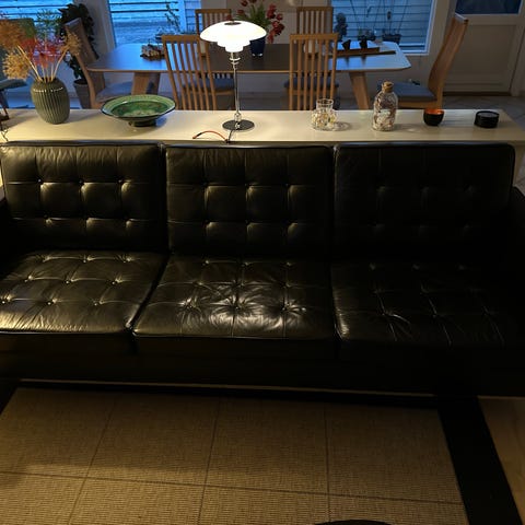 Sort 3 Pers. Lædersofa m. 2 hynder i semianilin. Duntop sæde/ryg. Sorte metalben. En rigtig lækker slappe sofa.