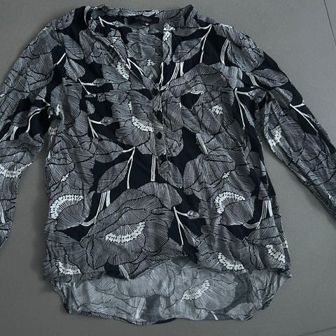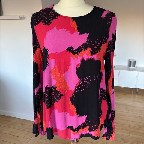 Fin bluse med bindebånd om livet, krave og lille hængsel så du kan vælge at lukke den til eller lade den stå åben i v-neck. Jeg har aldrig brugt den. Den har kostet 500 kr.