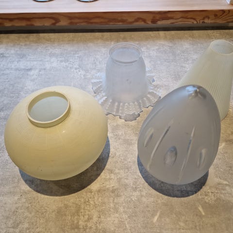 Anden loftslampe, Retro, 2 gamle glasskærme samlet, Monter evt. fatning på dem og brug dem som lamper ned over et bord. De smukke gamle glas er oprindelig fra en gammel lysekrone. Ikke 2 er helt ens, de er helt unikke. Sælges samlet for 425,-