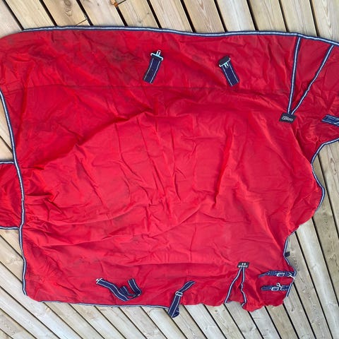Blåt fleecedækken fra catago med snoet lys kant (er ikke lige så skinnende som på billederne) og navnet 'Balthos' broderet på siden. Der er brugsspor på den lyse kant og ved at spænderne er lettere rustne. Det er str. 135/185.