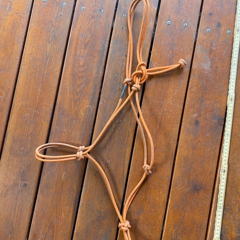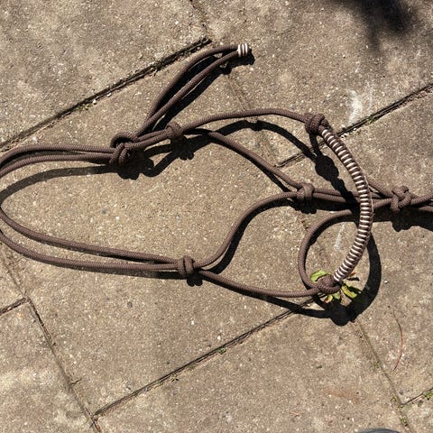 Sort rebgrime i str. Cob/full med træktov. Snoren rundt om næsestykket er lidt kluntet, da vi brændte det på, efter den var gået op (se billeder), men ellers i god stand.