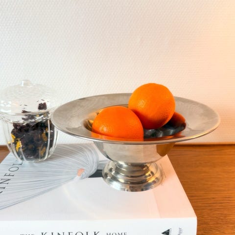 Vintage opsats i stål, Der er her tale om en fin vintage opsats / bordskål i stål med dekorative detaljer i kanten. Norsk produceret og stemplet:
