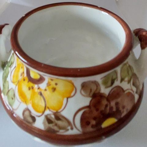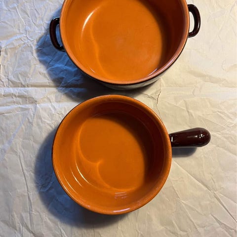 Skåle, i stentøj. Leverpostejskålen er glaseret og af mærket Moira og handmade, højde 7 cm og diameter 12,5 cm. Den anden skål er brun med beige kant og beige indvendig, højde 7 cm og diameter 12 cm. Begge skåle fremstår som nye. Send mobilnummer for nærmere aftale.