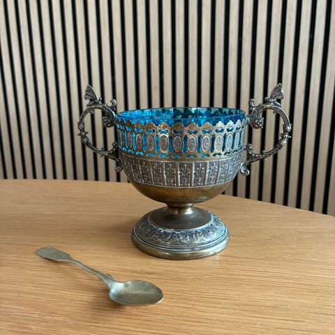 Sukkerskål i sølv med glasindsats, Højde 8 cm med hank 15 cm - bredde 10 cm