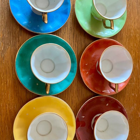Jeg er ikke sikker men tror de er hjembragt fra Syd/Øst Europa engang i 60/70erne måske Italien det gamle Jugoslavien eller Tjekkoslovakiet, men det vel egentlig også ligegyldigt, de er i fin stand og der er 6 kopper i forskellige farver med guldkant og guldhank desværre er der kun 5 underkopper så betragt den 6 kop som bonus og køb 5 meget fine aldrig brugte mokka kopper.