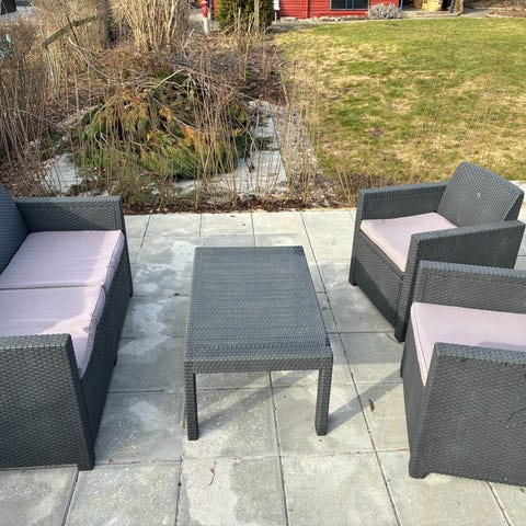 Sæt "Allibert" (Holland): 1 lænestol, havesofa og bord) - 866 kr. Material - 100% plastik.
