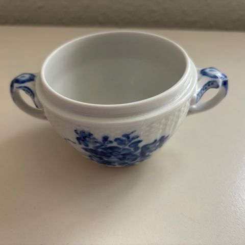 Blå blomst 11 cm dia. Stor sukkerskål med låg og hanke.