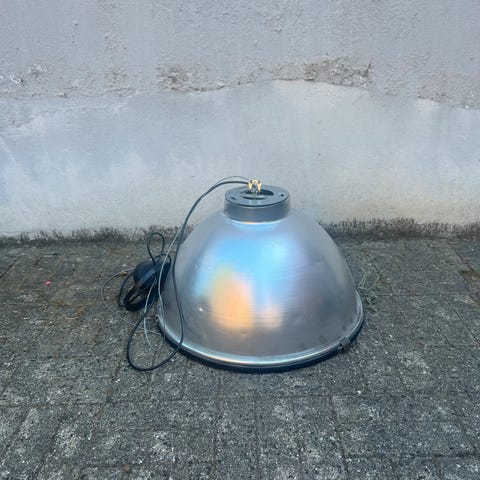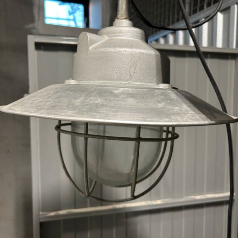 DIY projekt - gammel retro industrilampe med to lysstofrør. Trænger til en ny ledning.