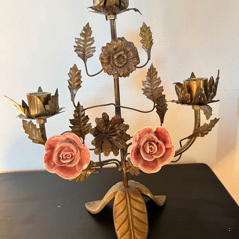 Smukkeste gamle antik 3-armet fransk lysestage med 4 lyserøde porcelænsblomster sælges.