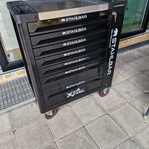 Værkstedsvogn (uden værktøj)fra ks tools (Dakar Racing edition) med enkelte rustpletter- mest i bunden. En lille revne i toppladen. Trænger nok også til en klud :)