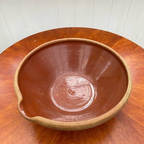Dejfad i keramik. Brugt få gange. Har et lille skår på kanten. Det lyse mærke i bunden er under glasuren. Kan rumme 3 liter. Dia: 31,5 cm. H: 11 cm.