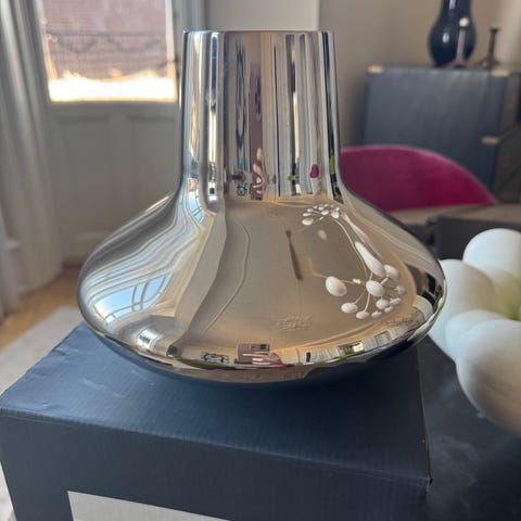 Henning Koppel er en mester i minimalistisk, skandinavisk design. Den store vase reflekterer lyset og fremhæver blomsternes skønhed. Brug også vasen uden blomster, da den skulpturelle form pynter på bordet eller i vindueskarmen.
