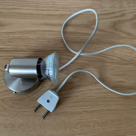 lille halogenspot komplet, inkl. skruer til montering direkte i strømudtag (uden brug af transformer). Kan sendes.