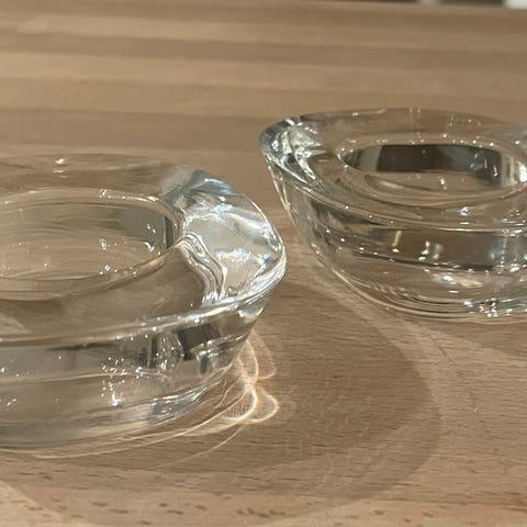 i glas, måler ca. 8,5 x 7 cm, H 2,5 cm, *helt nye*, i original æske, kan sendes. Samlet pris: 50kr.