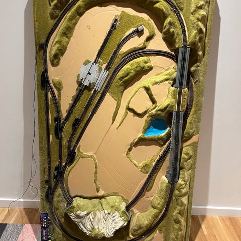 Der medfølger tog, vogne,skinner, transformer, huse, træer