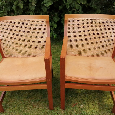 Jeg sælger én stol. Fletværket er helt i orden. Sædet er i god stand, men der er en lille skade i stoffet. Stoffet på sædet er af mørkeblå uld.