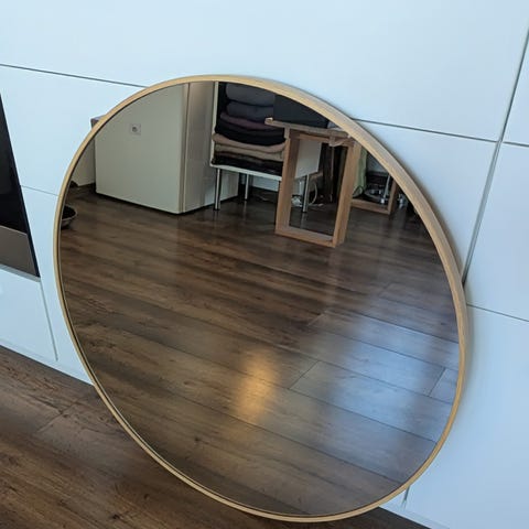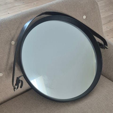 Rundt spejl med sort læderstrop Ø: 60cm