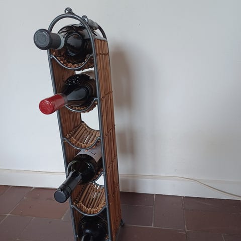 Den fineste lille vin reol, med gummi dutter under fødder. Den er22 cm bred, 20 cm dyb og 41 cm høj.