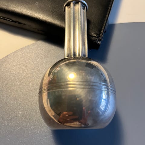 Vase i totårnet sølv, Svensk, Elegant svensk lille vase beregnet til én blomst. Fremstillet i pletsølv (totårnet). Firkantet fod med små "perler" på kanten. Højde 20 cm. Fine svungne linjer og tidstypisk for 1950'erne. Flot stand uden skader. Står på Mols men kan gratis leveres i Aarhus og Ebeltoft eller sendes billigt på købers regning