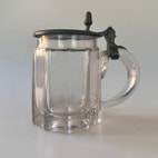 Robust og velbevaret hankekrus i klart fastbløst glas med påsat hank og tilhørende låg i tin. Kruset måler 14 cm i højden (inkl. knop) og har en diameter på 9 cm. Formen er typisk for midten af 1800-tallet, og den solide konstruktion med fastblæst kumme og plan fod tyder på dansk produktion — sandsynligvis fra Holmegaard Glasværk, som i perioden omkring 1860.