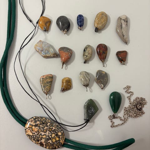 Vedhæng, 7 fine slebne sten med øje, så de kan bruges til halskæde.