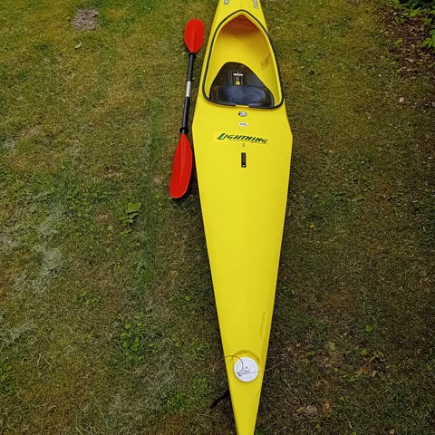 Kajakken har tidligere været træningskajak for juniorer i Holte Kajakklub. Kajakken er fuldt funktionsdygtig. Nogle skrammer på næsten, men ellers rigtig pæn. Båden kan blive rigtig flot med en dåse hvid og en dåse gul gelcoat.