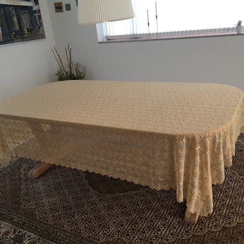 Meget smukt dug i ren hør med smukke, broderede fjer og en flot, bred kant i en lidt anden farve og et andet stykke stof. 170 x 170 cm. Kan bruges som fx et tæppe i en lænestol eller en sofa. Skal renses.