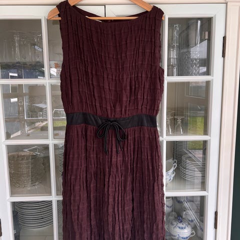By Malene Birger brun kjole med smukt dekoration (den ene skal syes fast). Str. L i viscose. Der er et lille hul i kjolen, som kan syes. 100,-